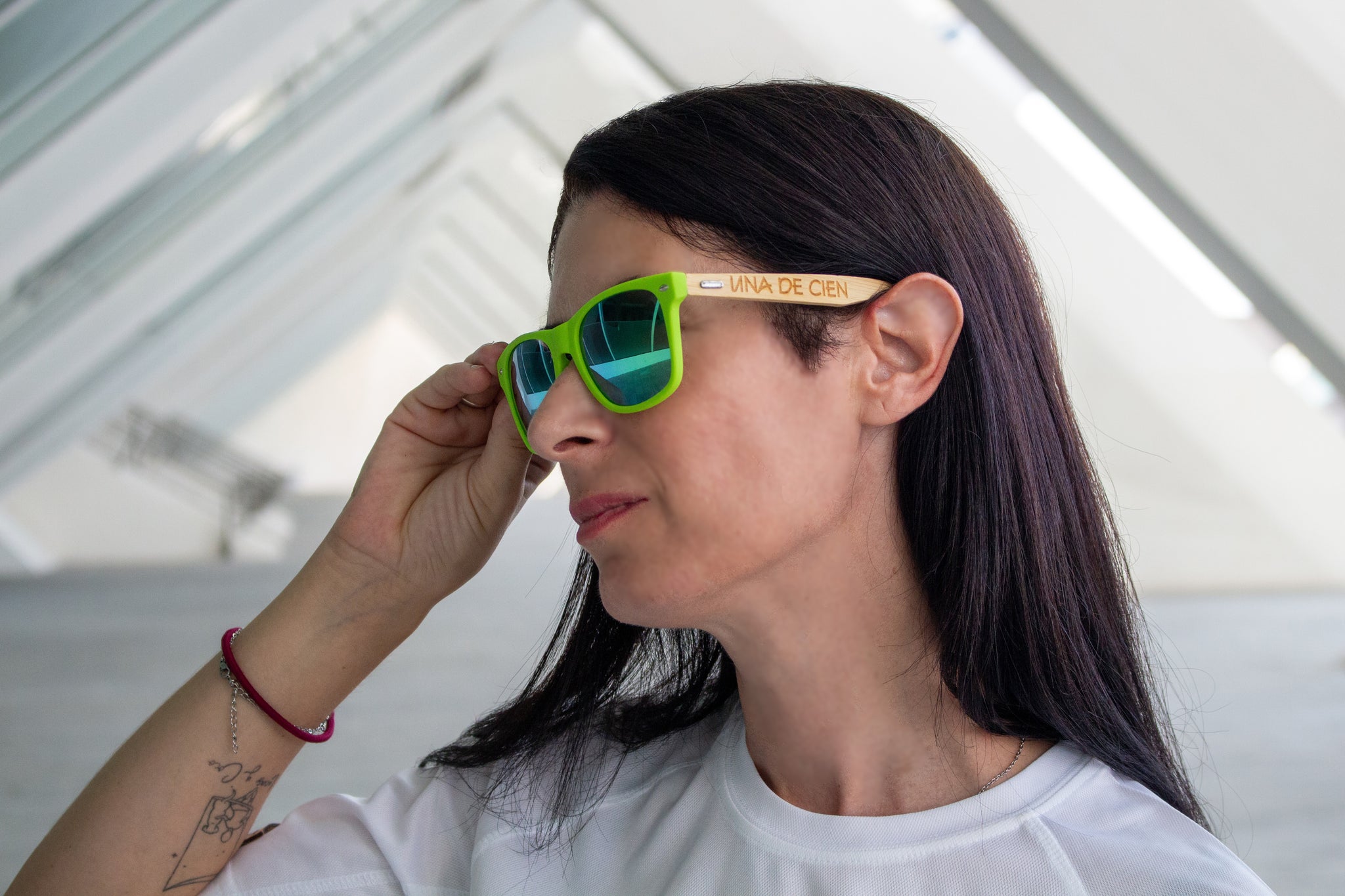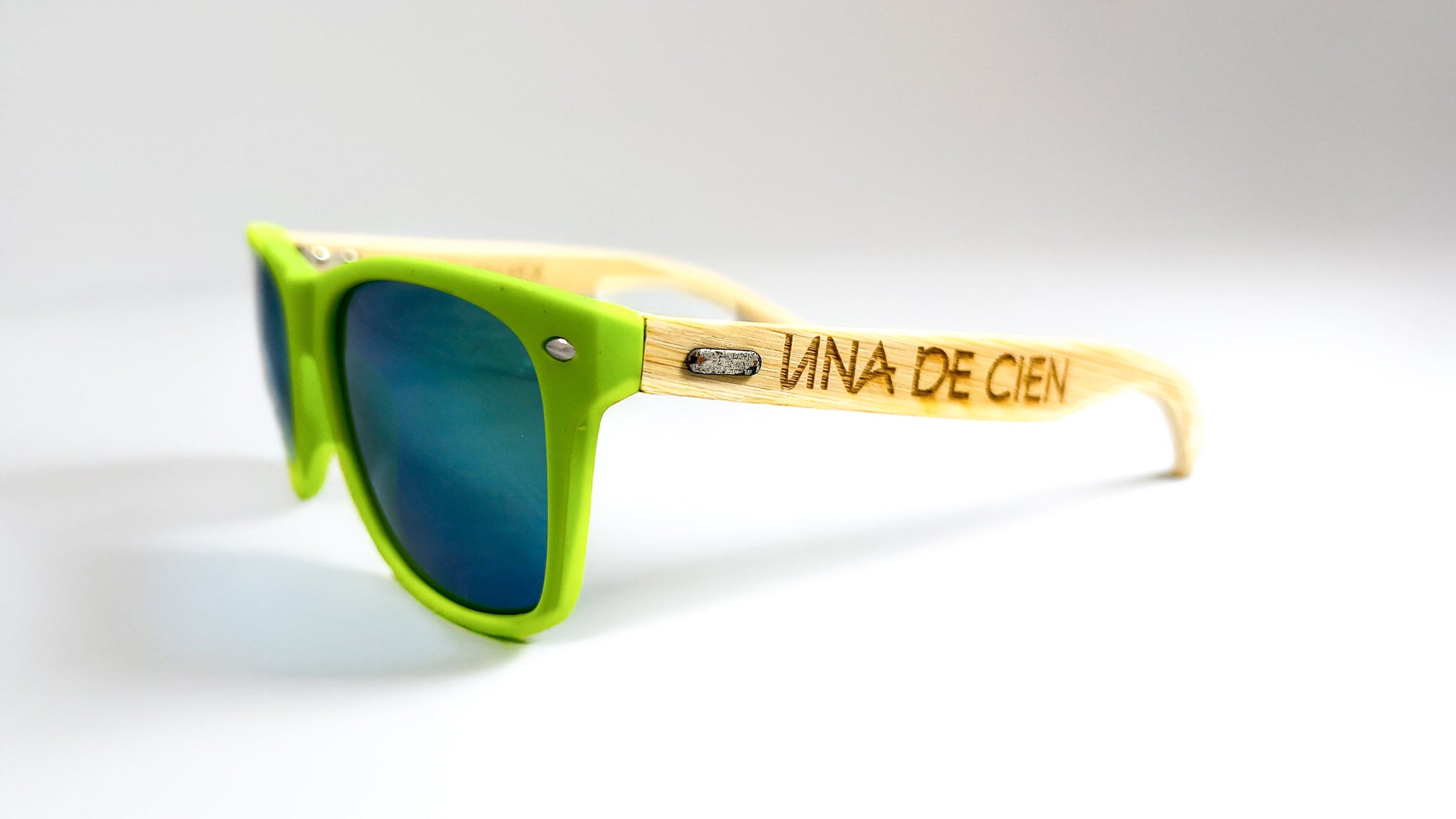 Luce unas gafas de sol con montura verde y patillas de bambú grabadas a láser. Son ligeras, ecológicas y cuentan con lentes de protección UV400 que bloquean los rayos UVA y UVB. Diseño exclusivo con conciencia sostenible para un estilo único.
